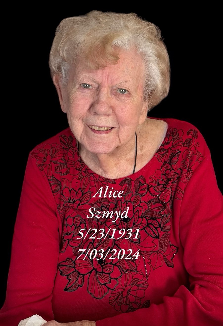 Alice M. Szmyd, 93, of Glassport, died July 3, 2024. She is the daughter of the late Leo and Mary Cegelski and wife of the late Walter Szmyd. She is survived by her sons Dan (Debbie) Szmyd, and Richard (Jenifer) Szmyd; daughters Cheryl (James) Opfer and Bonnie (the late Frank) Wakefield; grandchildren Matt, Julie, James, Rachel ,Frank, Brandon and Jacob; great grandchildren Ruby, Henry, Alex, Hayley, Hunter, Hadlee and Huxley and her best friend Rita Cross. She was preceded in death by her grandson Vaughn; brothers Stan and Ray Cegelski; sisters Vera Bosetti, Sylvia Skibinski, Pearl Nagy, Regina Kubas and Dorothy Ploskina. Alice was a member of St. Joachim & Anne Parish, Christian Mothers and the Rosary Society. Alice enjoyed her afternoon card parties with her friends and looked forward to her Bingo days. A funeral mass will be held Tues., July 9, 2024, 10:30 am at Queen of the Rosary Church. Inurnment following in Calvary Cemetery, Port Vue.